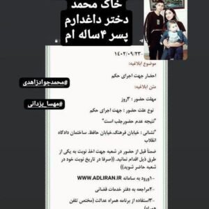 مهسا یزدانی مادر جاویدنام محمدجواد زاهدی با انتشار استوری اینستاگرام از دریافت ابلاغیهای جهت اجرای حکم حبس خود خبر داد و نوشت: سه روز مهلت حضور برای اجرای حکم خیلی کمه، سه روز به کدام یک از گلهام توجه کنم؟ خاک محمد، دختر داغدارم، پسر چهار سالهام